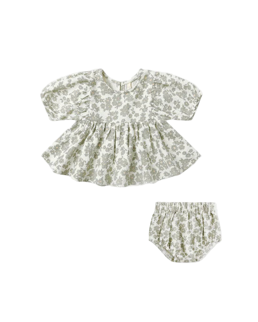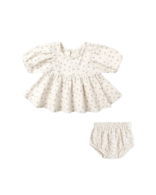 Our Sophia Top & Bloomer Set features a full gathered blouse, balloon sleeves, button backing, and matching bloomers with a ruffle at the waist...